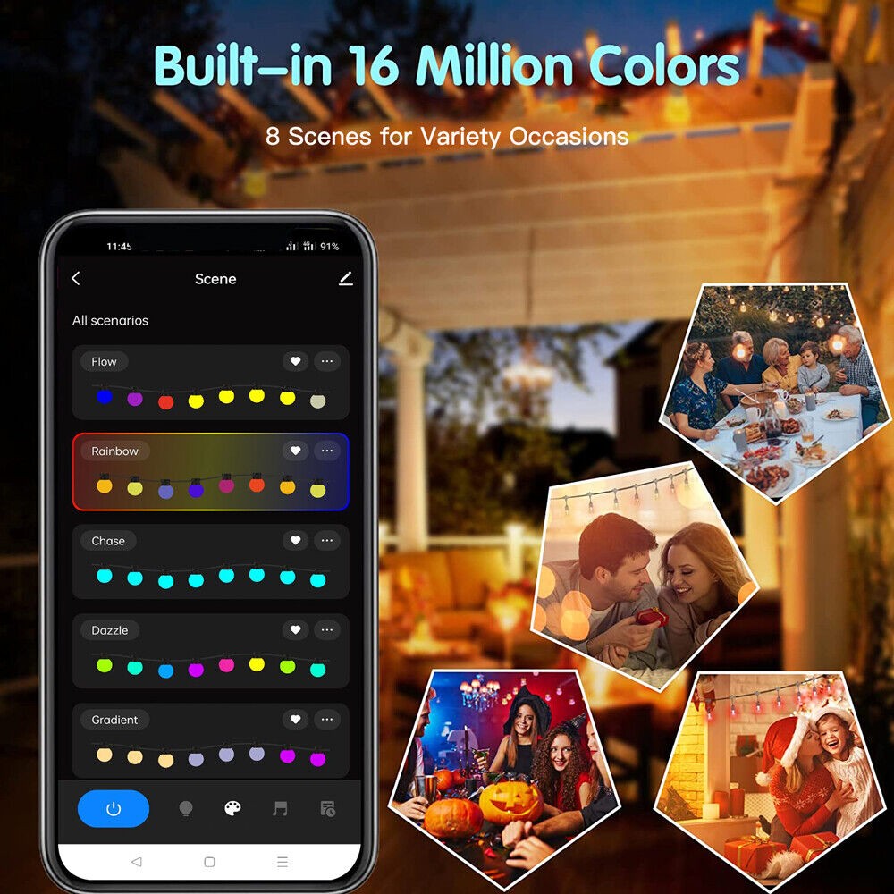 ?Connectable Festoon Lights--- Up to extend connect 3 string lights kits together (Each set 15M/48ft) by Male-Female connector, and up to control 45 Bulbs via WiFi App directly, no need to pair again; Ideal for patio, deck, backyard fence, pergola, porch, bistro, cafe.