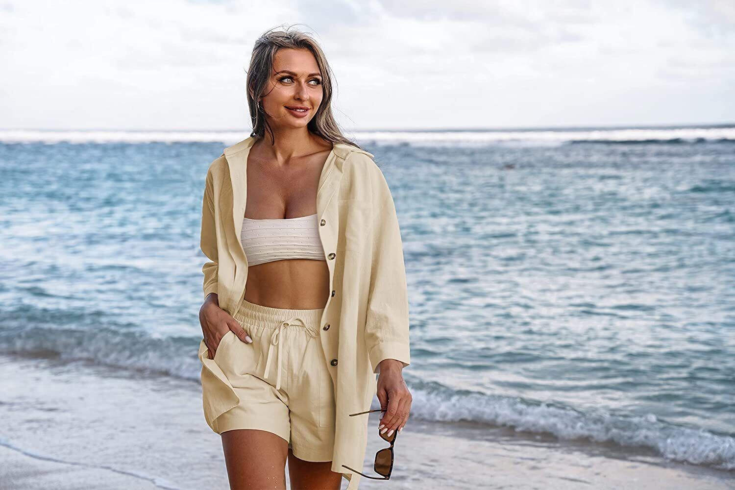 Beyove Women's Cotton Linen Set Casual Tracksuit Button Down 3/4 Sleeve Shirt