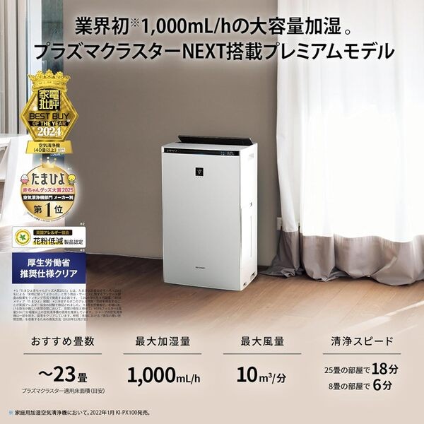 シャープ 加湿 空気清浄機 KI-RX100-W ホワイト プラズマクラスター NEXT(50000) プレミアム COCORO AIR搭載 空気清浄 46畳【自動掃除機能付き】 タンク容量 約4.3L/加湿量1,000mL