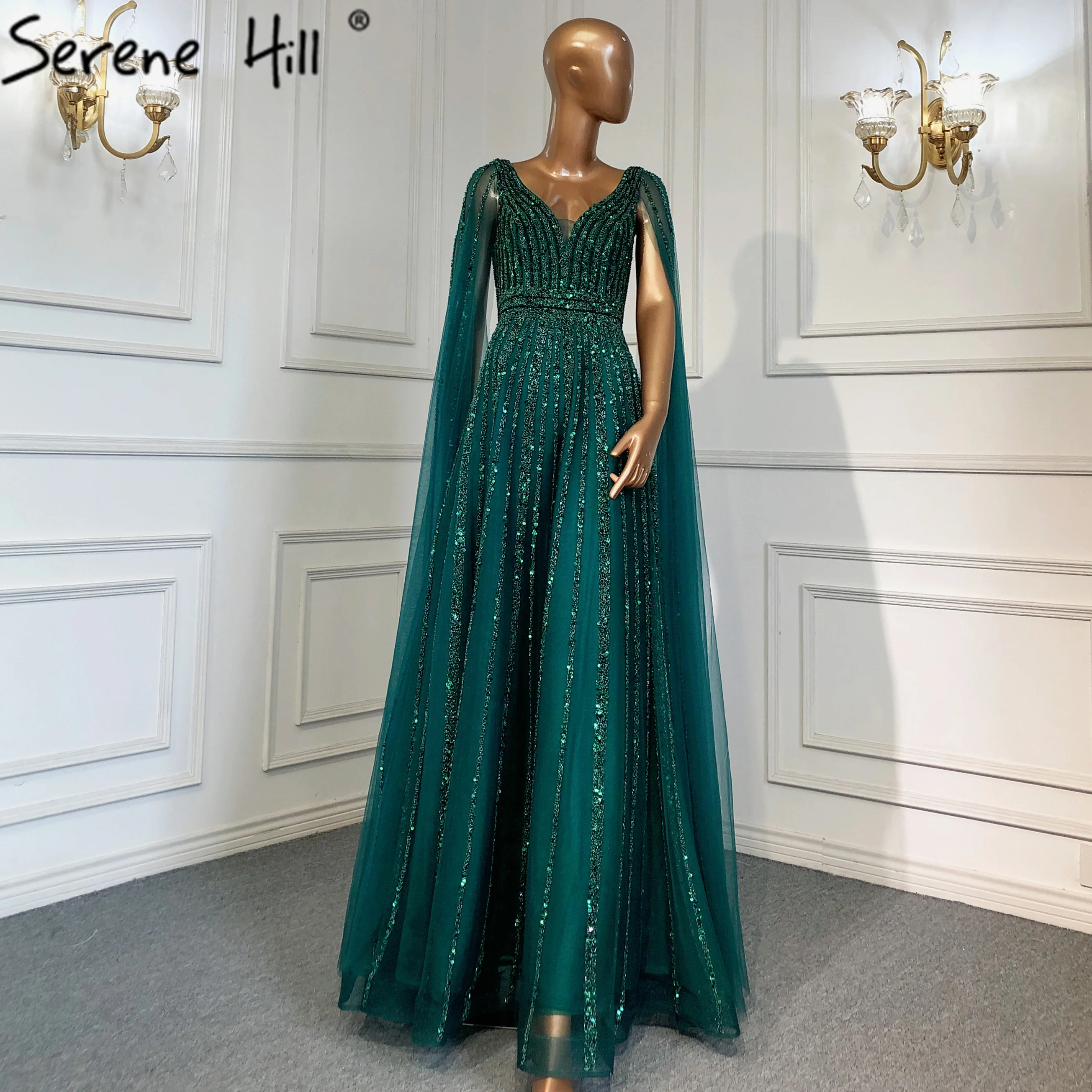 Serene Hill Nude Arabic Luxury Cape Sleeves Evening Dresses Gowns 2022 A-Line Beaded Sexy For Women Party CLA71567
