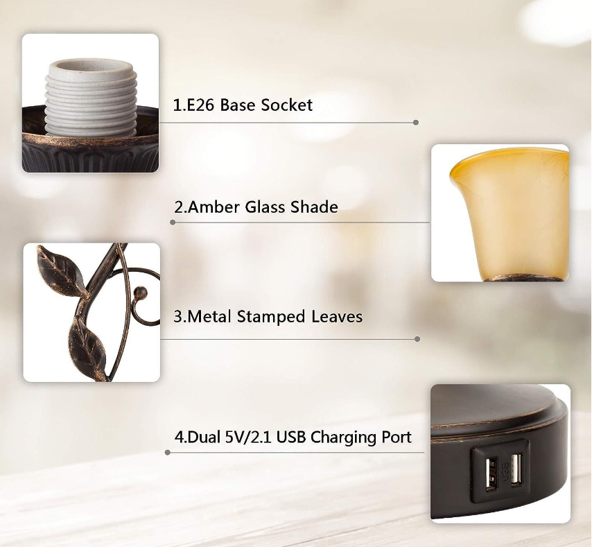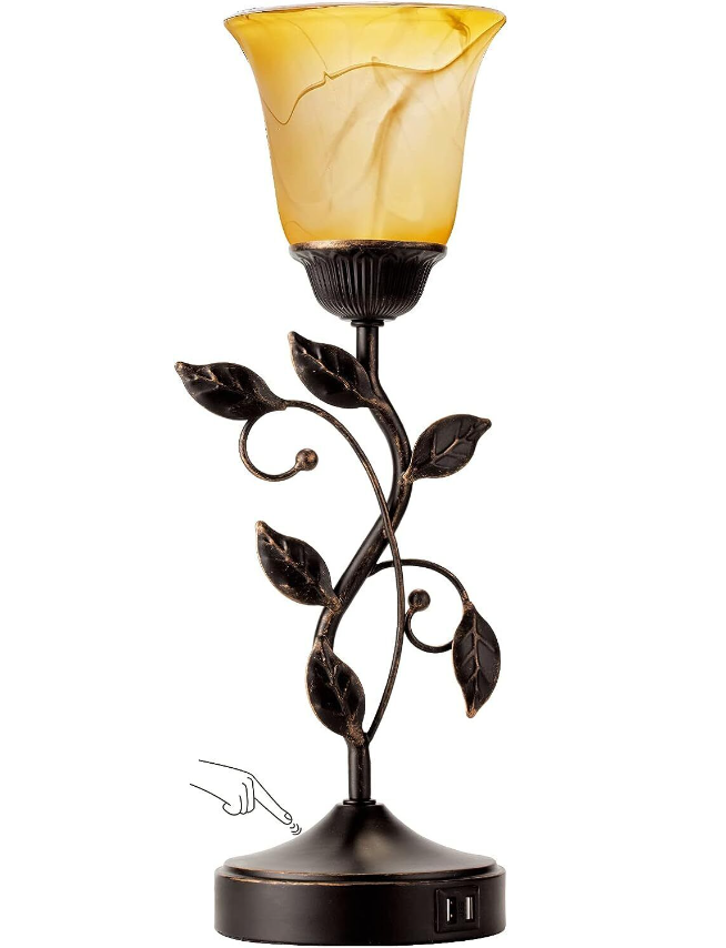TOUCH CONTROL TABLE LAMP WITH 2 USB CHARGING PORTS, 3-WAY DIMMABLE BEDSIDE NIGHTSTAND LAMPS, AMBER GLASS SHADE VINTAGE RURAL LEAF LAMP FOR LIVING ROOM, BEDROOM, DRESSER, LED BULB INCLUDED (BRONZE)