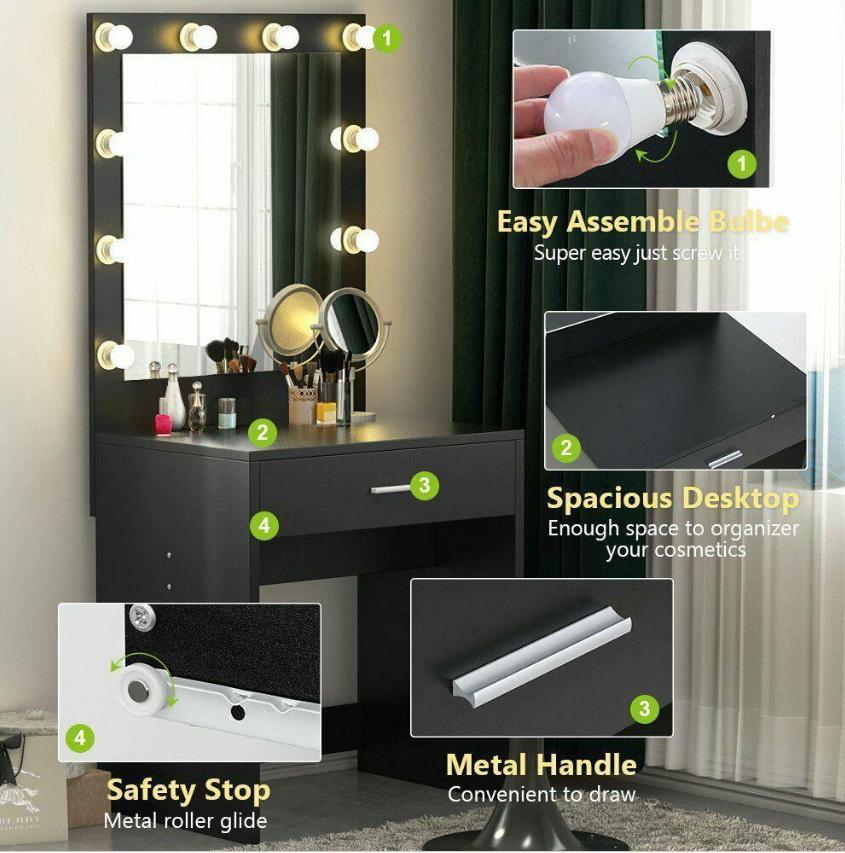 10 LED Lighted Vanity Table Set with Huge Mirror and Drawer Makeup Desk- ★sleek and simply, contributes both fashion and practicality to your bedroom or changing area